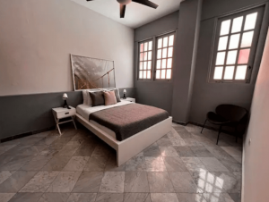 The 3rd floor penthouse has a 2,500 sq. ft. 3 bedroom 2 bathroom apartment with large windows and a private patio area. Lots of space. New floors, A/C units, high ceiling with fans and washer and dryer inside the unit.